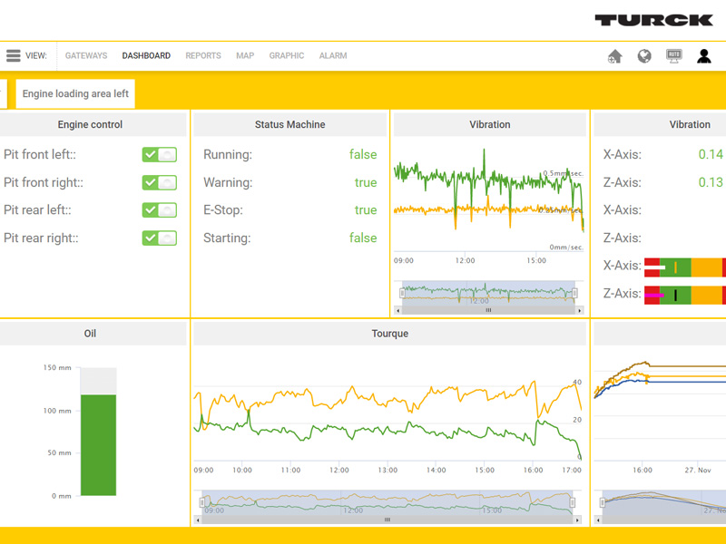 當前的機器數(shù)據(jù)和狀態(tài)顯示在操作面板,例如圖爾克云中。用戶可以執(zhí)行不同的設(shè)置,以及設(shè)置在超出閾值時通過電子郵件或SMS發(fā)送通知等。該界面可以單獨調(diào)整,并且可以在需要時采用客戶自己的設(shè)計風格。
